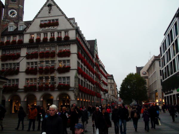 ノイハウザー通りは歩行者天国になっておりミュンヘン一の繁華街らしい人混みだ。 ブランドショップやデパートが並びウィンドーショッピングしながら進むとその先にマリエン広場がある。 |
