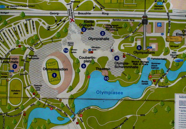 その時の旅行はシュツッツカルドのメーカーを見学した後にミュンヘンに来てオリンピックではレスリングと街道沿いで男子マラソンを応援した。今日はミュンヘン中央駅から地下鉄に乗ってOlympiazentrum駅へ、結構旧オリンピッック会場は人気の観光地らしく乗客の大半は同じ方向に歩いていく。 |