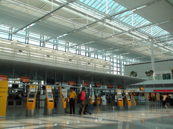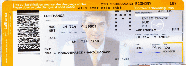 成田空港からフランクフルトまでは新機種の飛行機だったが、ミュンヘンから成田はまだ新機種ではないがその分席は二人席で気分はゆっくりだ。ミュンヘン空港からの便はルフトハンザ・全日空のコードシェア便なのでH38搭乗口前の乗客はほとんどが日本人だった。 |