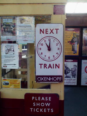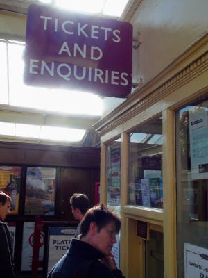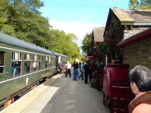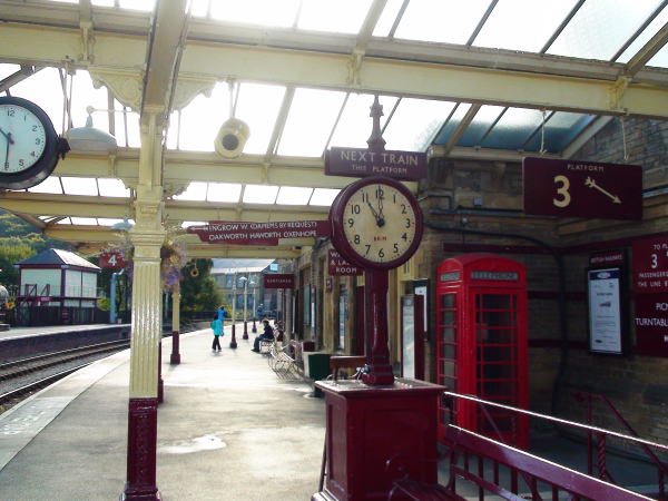 11:00発の電車は駅員さんから運転手さん、車掌さんまでみんな年配の方ばかりで退職後の仕事としている様子だった。駅舎はキースリーも途中駅もみんな絵本に出てくるような建物で週末だけの運行する蒸気機関車はハワースに11:20分に到着する。 |