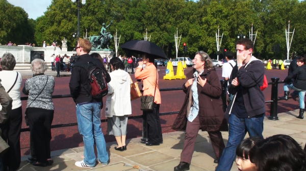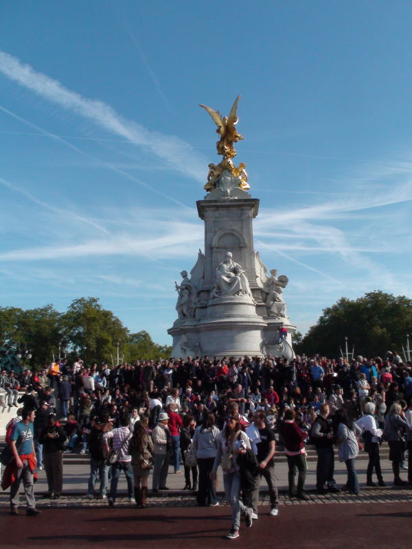 11時半から衛兵交替セレモニーが始るが、まだ30分も前なのに宮殿前のヴィクトリア・メモリアル記念碑の周りは人で埋まっていて、皆見やすい場所取りを競っている。 |