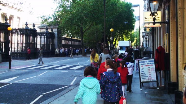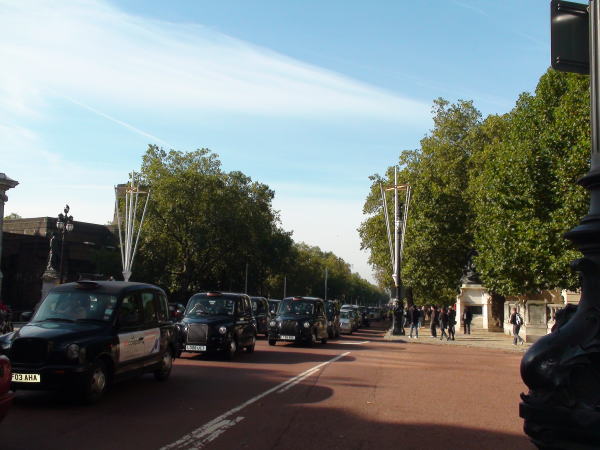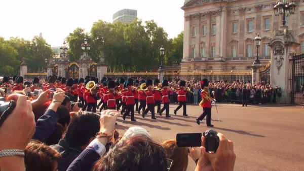 今日はロンドンを歩けるだけ歩く予定で、お水やおやつを持ってホテルを出発する。 最初はホテルから30分位で大英博物館前を通りトラファルガー広場前からバッキンガム宮殿に続く道”ザ・マル”を進みバッキンガム宮殿前広場へ。 |