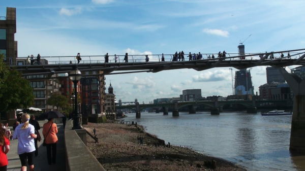 テムズ河畔はどこもジョギングコースのようで多くのジョガーが走って行き交い歩行者に対してのマナーは皆持って走っている感じがした。東京の皇居周遊コースではジョガーの歩行者とのマナーが問題になっているがテムズ河畔は皇居周りより排気ガスも少なく快適そうだ。 先には西暦2000年ミレニアム事業として建設された特異なデザインのミレニアムブリッジが、そしてロンドンブリッジ、更に先にロンドン塔横のタワーブリッジが小さく見えはじめる。 |