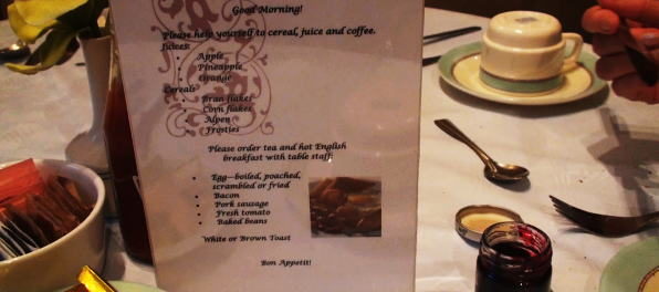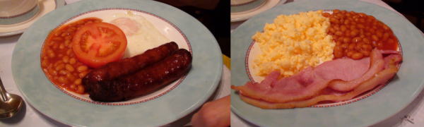 ロンドン3日目 今日も朝食はイギリス独特のイングリッシュブレックファーストで、メニューからリクエストして左がKのベイクドビーンズ(甘い豆の煮物)、フライドエッグ、かりかりソーセージ、焼きトマト 右はMのリクエストしたもの、ベイクドビーンズ、ベーコン、スクランブルエッグ、パンはトーストと揚げパンそして紅茶。イギリス料理といえばロースとビーフにフィッシュ&チップスであまり評判が良くないがイングリッシュブレックファーストは豪華でないがいかにも朝ごはんらしく味わい深い。 |