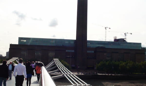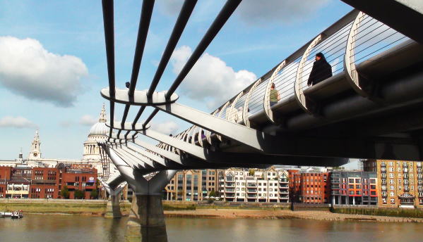 セントポール大聖堂を背にしてミレニアムブリッジを渡る。河の中央からはさっき橋の下から見えたロンドンブリッジとタワーブリッジが左側に、右にはブラックファイアーブリッジ、今から行くウォータールーブリッジが見える。それぞれの橋には特徴があり橋をジグザグに渡るのも楽しい。 |