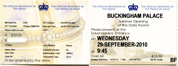 9月29日ロンドン2日目の朝はバッキンガム宮殿見学ツアーに参加するため早起きしてStパンクラス駅からビクトリア駅へ地下鉄に乗り9:15分頃チケット売場に着くと、当日券を買い求める人の長蛇の列でそれを横に見ながら9:45分の予約の列に加わる。しばらくして係員が列の先頭に立ち簡単な説明後列を先導して入場口へ。入口で空港並みに厳重なセキュリティチェックを受けてやっと中に入る。日本語のガイドフォンを借りそれを聞きながら順路に従い見学していく。 |