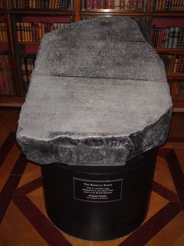 ![]() 紀元前3種類の古代文字で書れたロゼッタストーンは1799年ナポレオン軍によってエジプトのロゼッタで発見され、その後1801年イギリス軍がエジプトに上陸フランス軍を破りロゼッタストーンはイギリスに持ち帰られ、1802年以降大英博物館で展示されている。1822年に古代文字のうちギリシャ文字が解読され以後エジプト文字の解読も進んだ。 碑文は古代王朝メンフィスの宗教会議の布告を書き写した物で皇帝礼拝の実施方法が書かれている。2000年以上前、紀元前の石に刻まれた文字を見ると日常の人間の営みなどささいな事かと思われる。 |