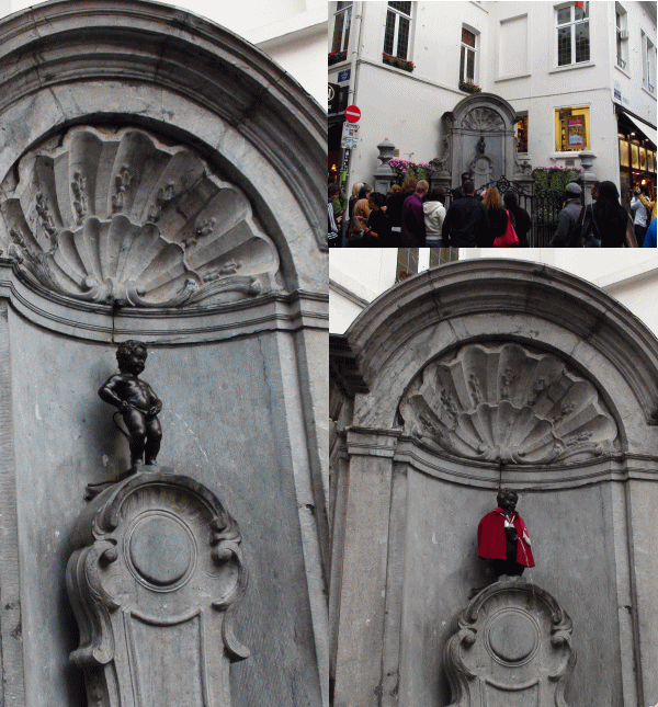 グランプラスにはすっかり魅了され沢山写真撮影をした後、広場から5分位の商店街の一角にある、『小便小僧』像前にでる。何と言うことのない像なのに世界中から人を集める観光大使を生み出した巧みな宣伝センスには感心する。 |