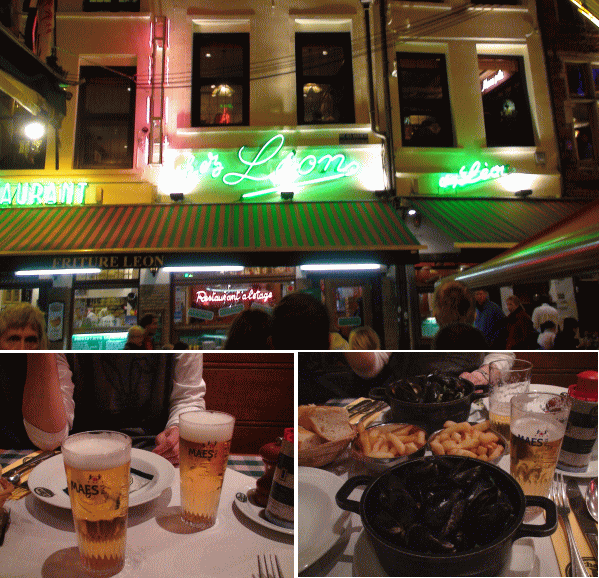 王家の脇道を入るとレストランが軒を並べ客引きが声を掛けてくる。どの店も外にテーブル席を作っているので狭い道が更に狭く歩きにくい。パリで食べた『レオン』の看板が懐かしく入って夕食。 |