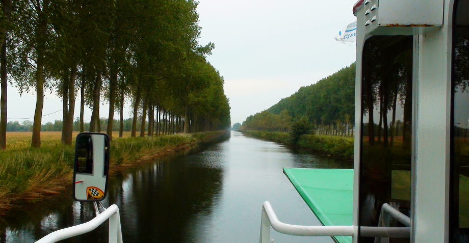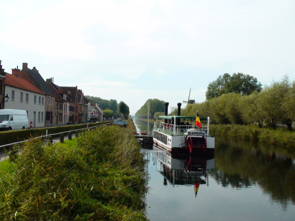 運河の航路は両側を広い牧場にはさまれた中の一本の直線のような水路だった。 ダムまでは4キロメートルの水路を35分のゆっくり船旅。 ダムに着くとすぐ街が始り観光客は順路を歩くようにメインストリートに入っていく。 |
