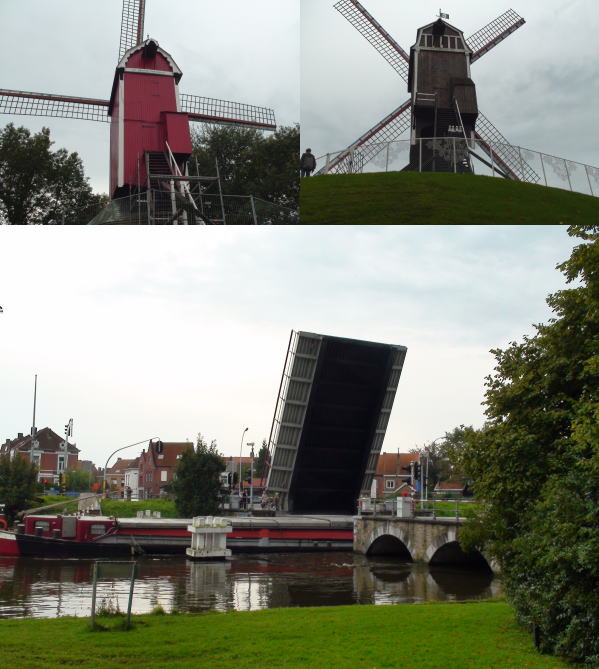 ブリュージュ市内から約一時間運河沿いを歩いてダムへ行く船着場へ。 運河沿いの道はよく整備された小道が林の中に続き古い街中と又違い緑ゆたかなさわやかな散歩道だった。 歩道にはところどころに大きな風車があり見上げながらあるく。 |