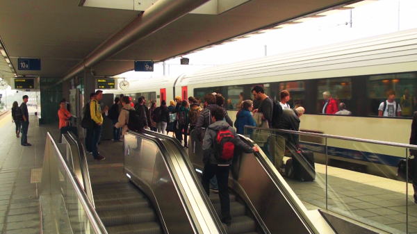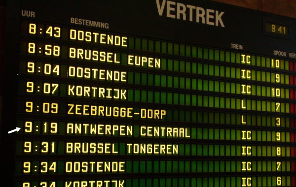 ブリュージュ9:19分発のアントワープ行きICはやはり席の予約をしていなった為満員ほとんど予約席で中年ご婦人二人と相席だったがなんとか席を確保して座る。朝のベルギーの電車は結構こむものだ。 |