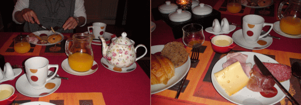 昨夜は宿泊客はうち一組だけ食堂も貸切りで朝食。卵焼きだけ注文を聞かれ目玉焼きにしてもらい、あとはチーズ・ハム・果物・トースト・飲み物など暖炉の前のテーブルからとりいただく。 食事しているとオーナー婦人が同居している娘さんと孫のスティーブン君をつれ食堂に入ってきて紹介してくれる。 スティーブン君はマルセイユのタダオより少し上の年頃だろうか、奥さんと片言でお互いの孫の話をする。 |