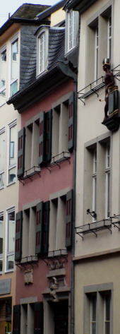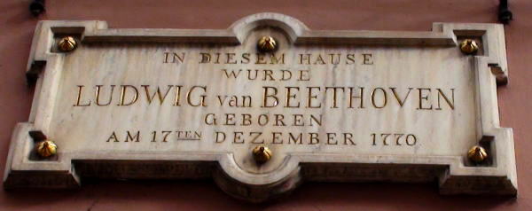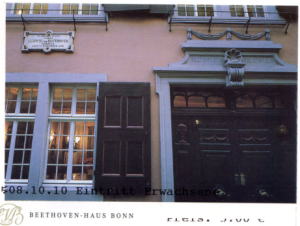 マルクと広場から小さな通りでやっとベートーベンの家を探し当てる。ベートーベンが生まれた家というものの特別な装飾や看板が出ているわけでなく入口にあるプレートだけである。ドアを開け中に入ると小さな切符うりばがありそこで入場料を支払い館内に入る。 |