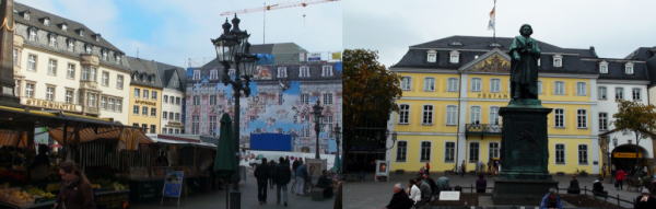 13:30分ボン駅について歩き始めミュンスター教会からマルクト広場に出る。小さな広場にはテントが並び野菜や果物など食料品の店でにぎわっている。 |