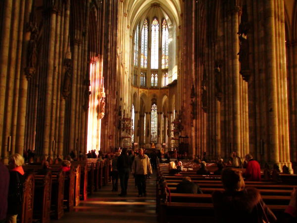 ケルン大聖堂に入り見事なステンドグラスを眺め着席する。聖堂天井から祭壇を見渡し静かに瞑想すると、どこの教会でもそうだが、信仰や宗教とは関わりなく、そうしていると、いろいろなことが心に去来する。 静かに想い巡らす事でこころ休まる。 |
