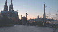 ケルン中央駅から夕闇の大聖堂横からライン河を眺める。明日は橋を渡って対岸を散歩する。 |