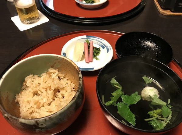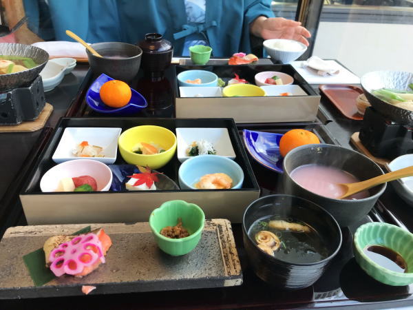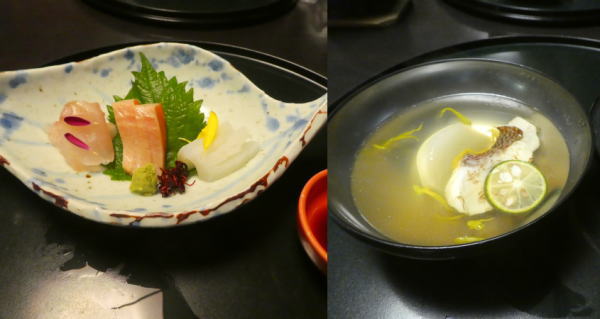 お造り、鯛煮物椀、蓮根万頭、メニューは連泊なので違った。