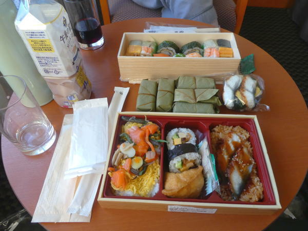 新幹線は新大阪16:54分なので夕食お弁当などを買いに阪神デパート地下へ寄る。K=太巻と焼サバ寿司、M=手毬すしお弁当を買う。