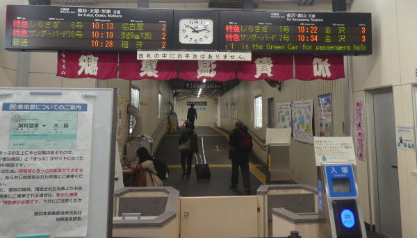 加賀温泉駅発10:28分福井行電車に乗り、11:02分福井駅着、11:12分の敦賀行に乗換えて、12:04分敦賀駅着、ここでまた乗換えて、12:23発京都行で、13:58分京都駅着、今日最後の乗換え。京都駅発14:03分の奈良で、14:48分目的地の奈良駅に到着した。特急乗らないで安く移動する移動は時間はかかるが、いろいろな駅の様子や車窓風景が見れて楽しい。(特急料金4400円が節約できた)