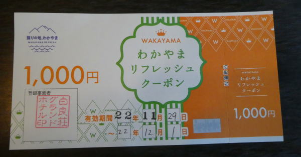 ロビーでスタッフに迎えられてフロントへ。ワクチン接種証明と身分証明書を提示して必要事項記入して和歌山クーポン\12000分もらって、チェックイン完了。
