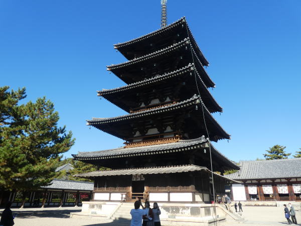 すぐに五重塔と金堂が並びたち1300年の風雪を耐えた日本最古の寺の雰囲気。