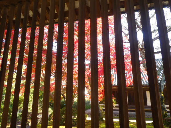 回廊の連子窓、菱形の木を縦に連ねた窓で採光、通風、防犯を目的としている。その窓はとても美しい。