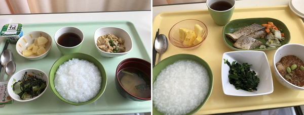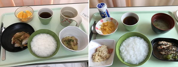 | 食事時間は、朝=7:00~ 昼=12:00~ 夕=18:00~ ご飯は退院するまで、お粥にしてもらう。薄味で一日の塩分量は6グラム以下で、生魚や加工肉は提供されなかった。 | |||||||||||||||||||||||||||||||||||