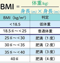 BMI= 体重(Kg)÷身長(m)×身長(m) BMIはボ体重と身長から算出される肥満度を表す体格指数で国際的な指標として用いられている。健康を維持するためにBMIを把握することが重要。 |