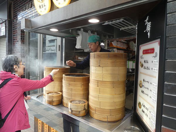 | アーケードの一角のベンチに座って、早速熱々の”肉まん”あんまん”をいただく。 味はごく普通で、テレビで取り上げるほどでないと思った。 |