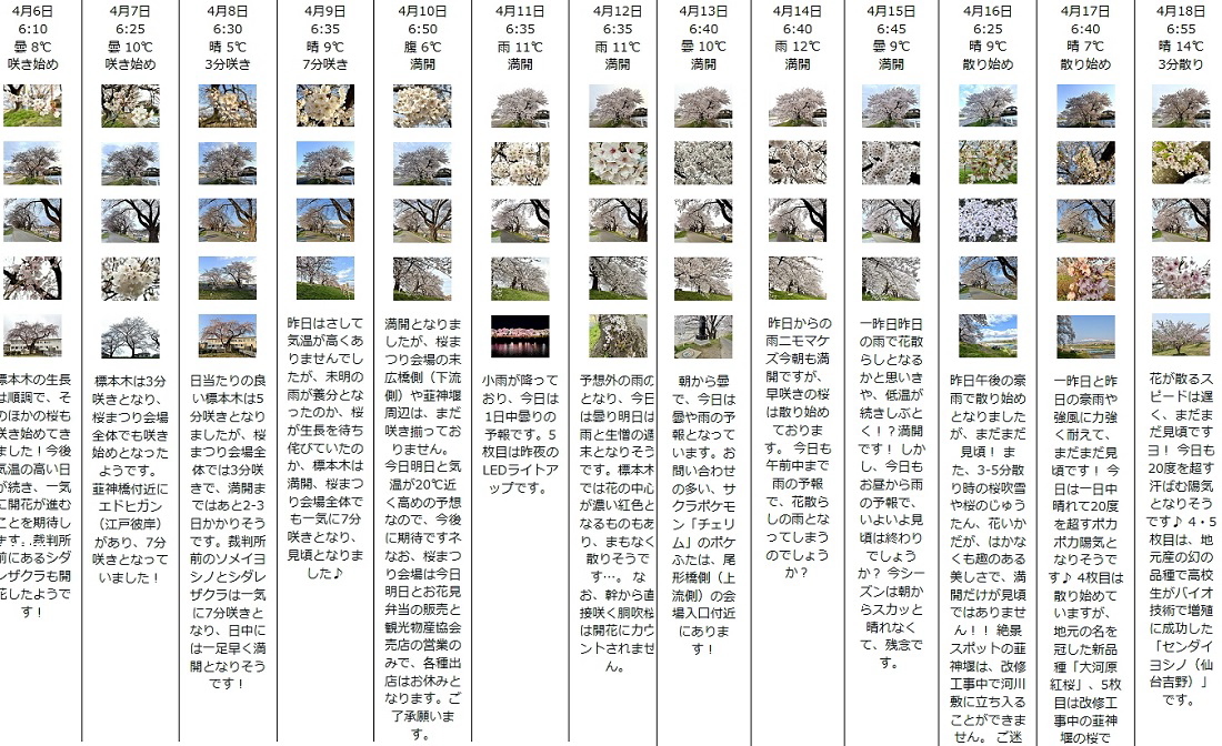 | 大河原町のサイトで"白石川堤一目千本桜"の開花状況が日々報告された | |||||||||||||||||||||||||||||||||