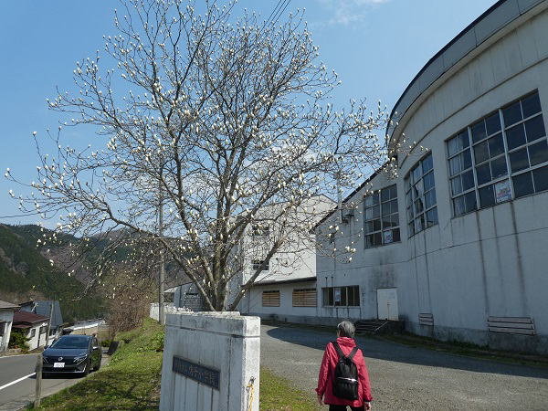 | 。 鳴子小学校前に出る。校門脇に、きれいなこぶしの花 。 白樺〜 青空 南風〜 こぶし咲くあの丘北国の 北国の春 ♪♪♪ |