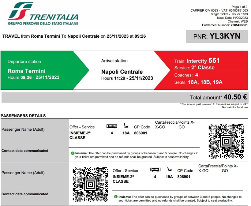 11月29日 シチリア島/パレルモ~メッシーナ(乗換)~カターニャ 鉄道チケット Palermo~Messina(乗換)~Catania 鉄道チケット |
