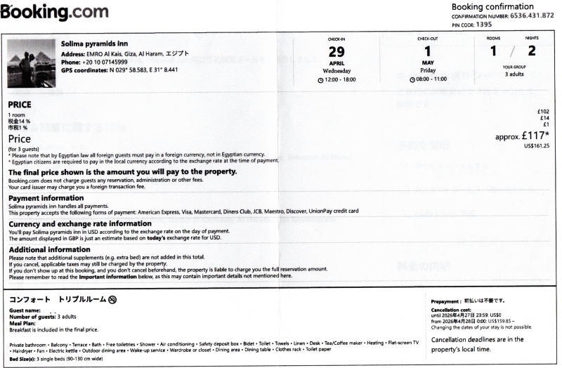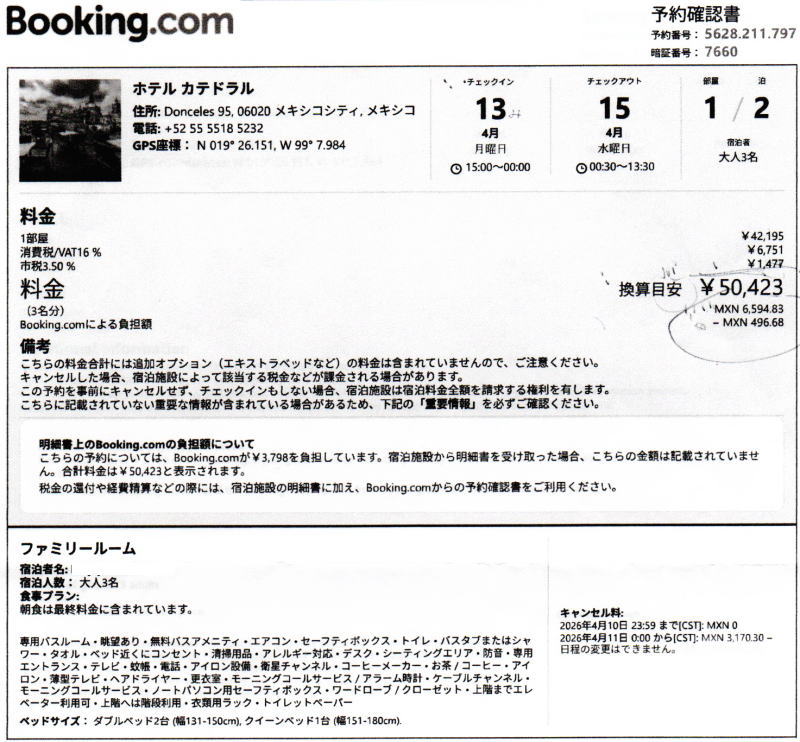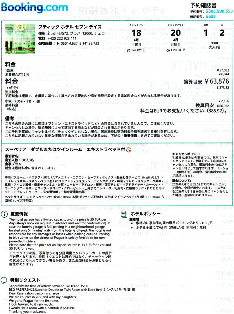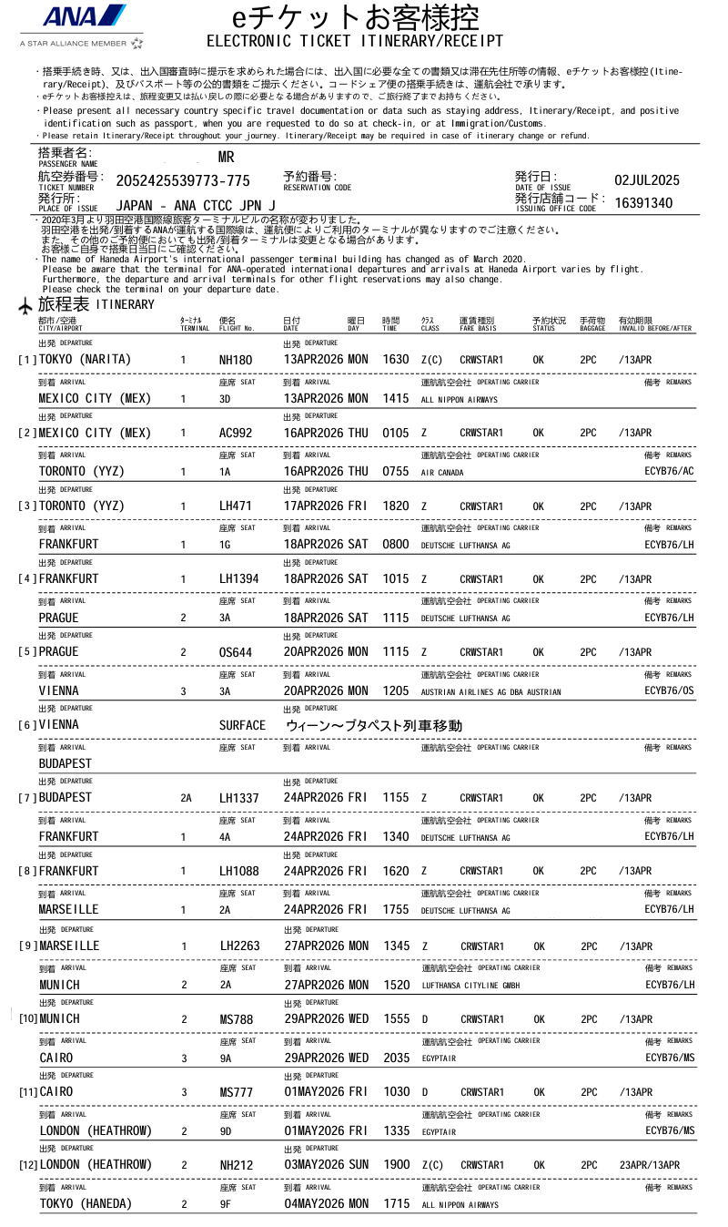| 2025年6月25日計画通りにANA国際線予約窓口に電話する。 ANAの国際線予約電話は中々通じないと度々聞いていた。 早朝4:15分に電話始める、案内通りにボタンを押して、あとはひたすら待つのみ。「ただいま電話が大変混みあっております......」のメッセージを聞きながらひたすら待つこと二時間半~ 6:45分やっとオペレーターに繋がる。 用意したメモ見ながら、一日目から順番に希望のフライトを確認していく、4月13日~5月4日帰国まで全便計画通りの航空会社でフライト&座席が確保できた。 しばらくして伝えれらた合計金額はほぼ予定通り3名で運賃+税金+手数料=¥2919720円(運賃\2116500、税金等\786720、発券手数料\16500) 『世界一周航空券』は二つの航空会社のグループがある。日本では”JAL”と”ANA”の加盟するグループで比べた結果、利便性、加盟航空会社の多いスターアライアンスに決める スターアライアンス世界一周航空券の基本ルール 1)方向: 東回りか西回りのどちらか一方(逆回りは不可) 2)海峡横断: 太平洋と大西洋を各1回ずつ横断 3)出発地: 同じ国から出発し、最終的にその国に戻る 4)有効旅行期間: ビジネスクラスは最低10日~12ヶ月 5)区間数: 最大16区間(運賃タイプにより異なる) 6)同一都市での途中降機は1回まで 7)経由は3回まで スターアライアンス世界一周航空券の基本ルール 1)出発地から東回りか西回りのどちらか一方向 2) 太平洋と大西洋を各1回ずつ横断する 3) 同じ国から出発し、その国に戻る 4)旅行期間: ビジネスクラスは最低10日~12ヶ月 5)区間数: 最大16区間 6)同一都市での途中降機は1回まで 7)乗継経由は3回まで 値段は、クラスとマイル(距離)で決まる ** (29,000マイル以内)(34,000マイル以内)(39,000マイル以内)** ビジネス 705,500円 822,000円 958,900円 エコノミー358,900円 422,700円 494,600円 金額運賃+税金+手数料 \973240 (運賃\705500 税金等\262240 発券手数料\5500) 成田空港~メキシコシティ~カナダ/トロント~プラハ(frankfurt乗継)~ ウィーン(鉄道)~ブタペスト(frankfurt乗継)~マルセイユ~ミュンヘン~ カイロ~ロンドン~羽田空港 |