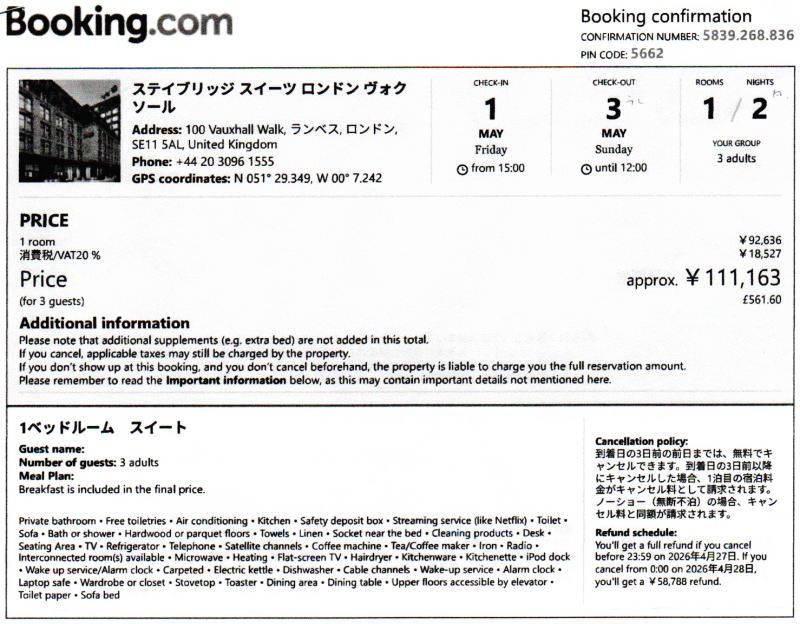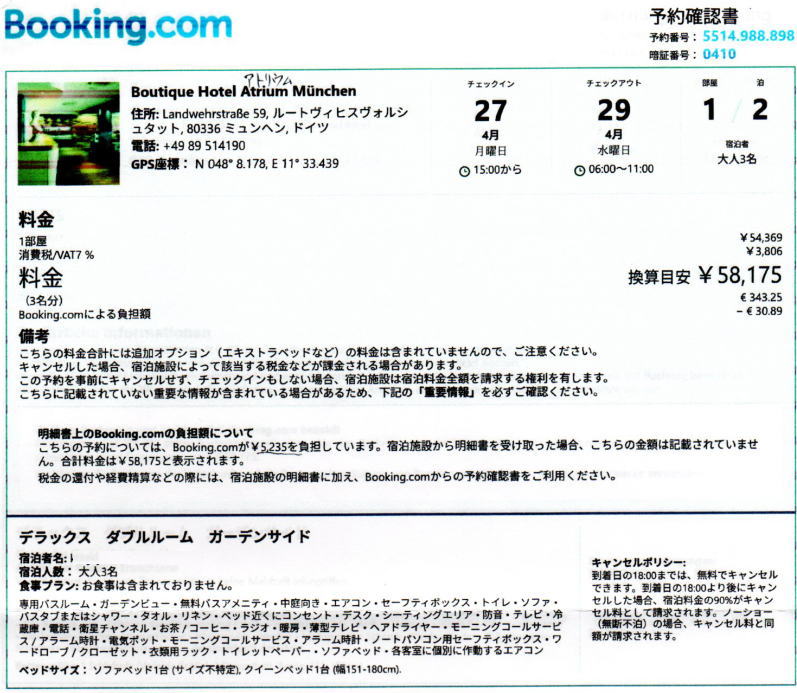 | 予約・発券! | 2025年6月25日計画通りにANA国際線予約窓口に電話する。 ANAの国際線予約電話は中々通じない話は度々聞いていた。 早朝4:15分に電話、案内通りにボタンを押して、あとはひたすら待つのみ。「ただいま電話が大変混みあっております......」のメッセージを聞きながらひたすら待つこと二時間以上~6:45やっとオペレーターに繋がる。 用意したメモ見ながら、一日目から順に希望のフライトをを確認していく、4月13日~5月4日帰国まで全便計画通りフライト&座席が確保できた。 金額はほぼ予定通り3名で運賃+税金+手数料で¥2919720円(運賃\2116500、税金等\786720、発券手数料\16500) |