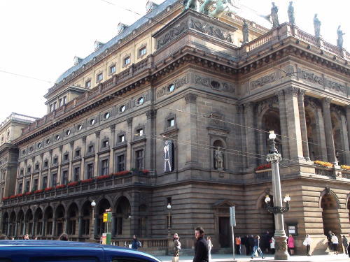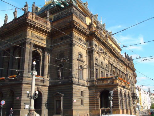 カレル橋前を左に折れヴルダヴァ(モルダウ)川沿いを歩くと左に立派な国民劇場、明晩ここでオペラを観劇する予定。