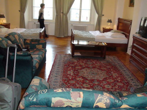 ホテルには地図では歩ける距離と考え駅を出て歩いていく。石畳の道はトランクをもっては歩きづらいがティーン聖母教会裏のホテルにチェックイン。部屋は別棟のレストラン上の24号室角部屋。部屋がとにかく広い、天井も高く少し落ち着かない。窓の外は石畳の道に左には教会の塔が見えて風情いっぱい。