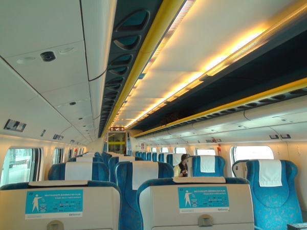 発車時間が近くなったので15番線ホームに入り停車中のプラハ行きの列車を確認、乗車する。予約した車両は通路を挟み1・2列でゆったりしている。車内はがらがらで乗客は2人の若い女性と我々だけだった。
