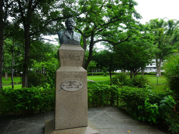 クラーク博士『Boys be ambitious(少年よ、大志を抱け)』の記された像を見る。 |